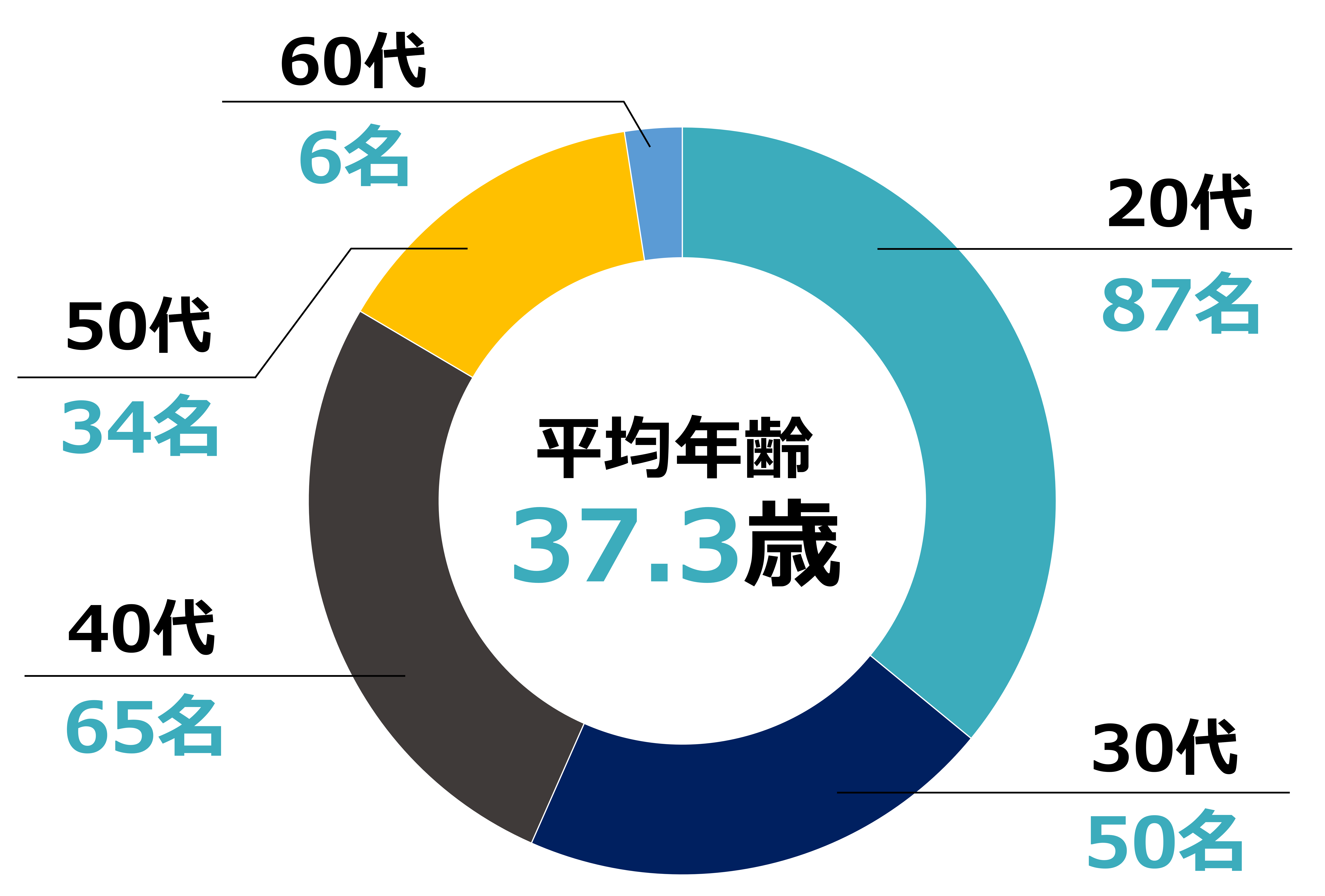 近年新卒採用に力を入れていることから、20代~30代が全社員の半数を占めています。